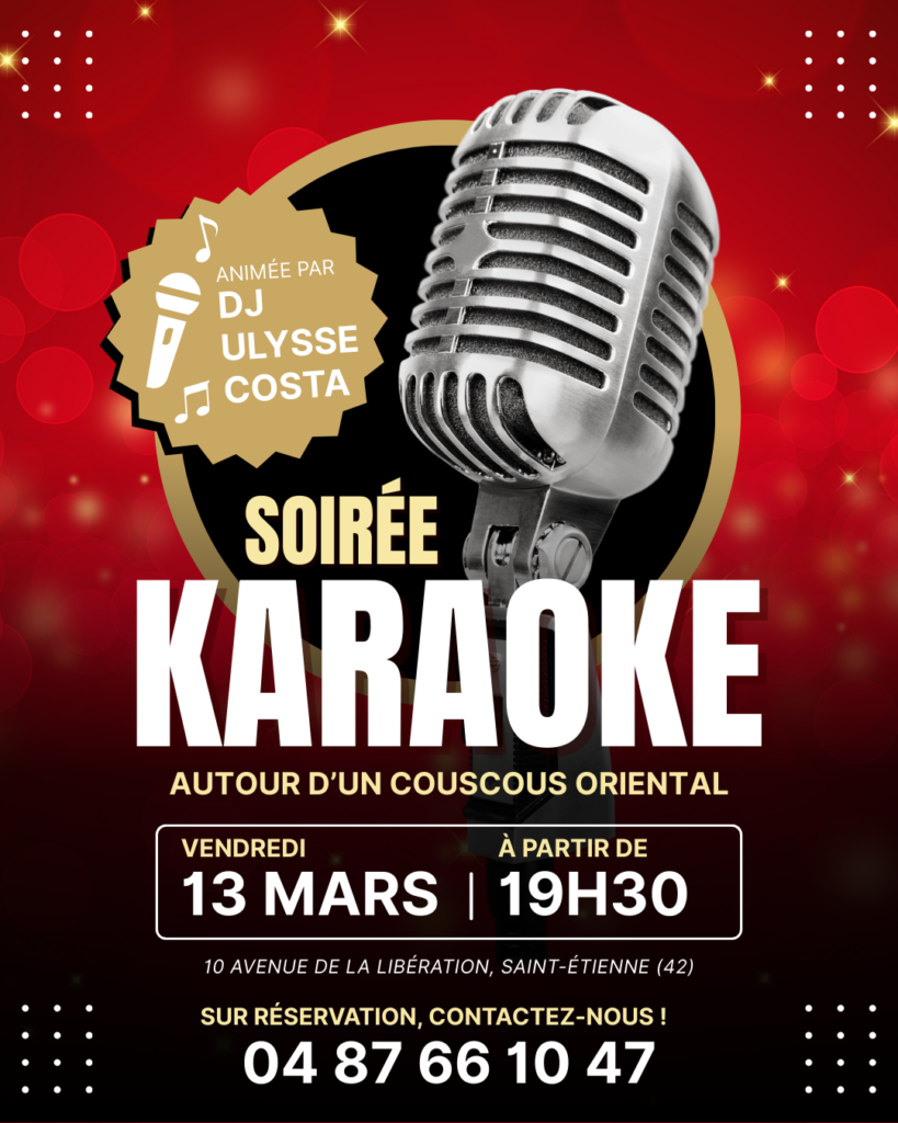 Rendez-vous ce vendredi 13 mars pour une nouvelle soirée d’exception ! Au programme : un grand karaoké animé par DJ Ulysse Costa, de la bonne humeur et une délicieux couscous oriental à partager.